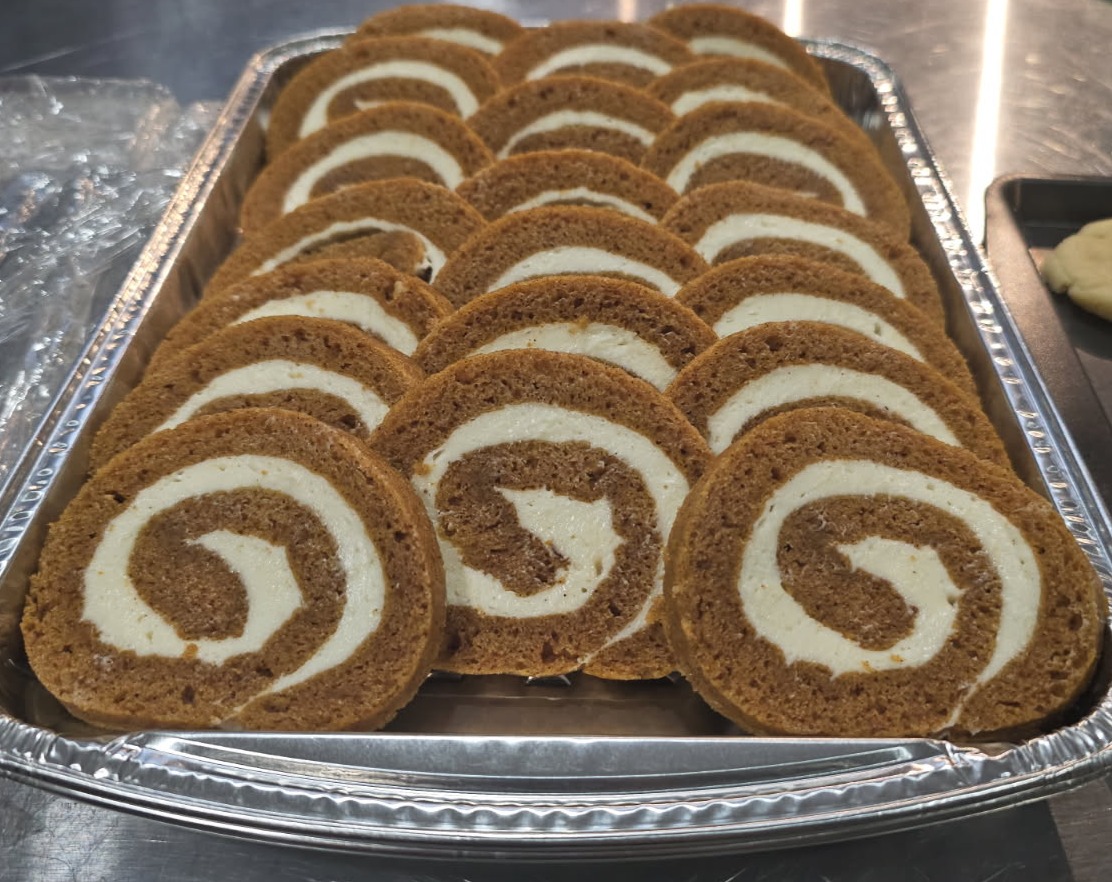 Delicious moist and tender pumpkin cake with a soft, touch of sweetness cream cheese filling rolled to perfection.  Each roll slices into approximately 20 slices and weighs approximately 2 pounds.